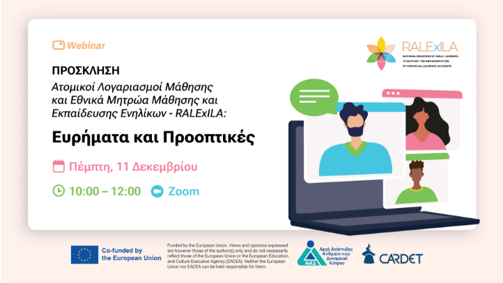 CARDET και ΑΝΑΔ σας προκαλούν σε ένα ξεχωριστό διαδικτυακό ενημερωτικό σεμινάριο με θέμα: «Ατομικοί Λογαριασμοί Μάθησης και Εθνικά Μητρώα Μάθησης και Εκπαίδευσης Ενηλίκων – RALExILA: Ευρήματα και Προοπτικές», το οποίο οργανώνεται στα πλαίσια ενημέρωσης του ευρωπαϊκού προγράμματος RALExILA.